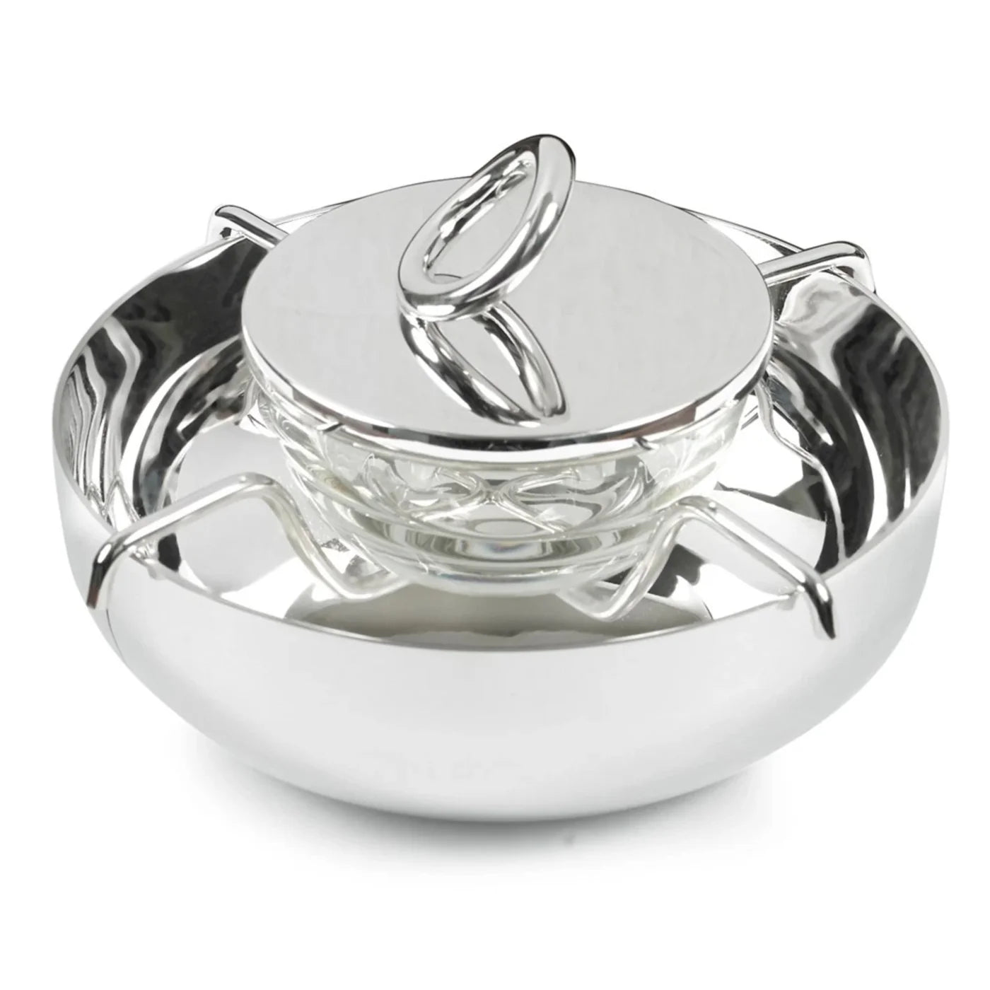 This three-piece silver plated caviar serving set in the Vertigo pattern contains an outer presentation dish for ice and a perfectly fit lidded bowl that can hold up to 4.4 oz of premium caviar. Vertigo’s bold motif - a subtly asymmetrical, thick ring often placed askew, can be found on every piece in this Christofle collection.